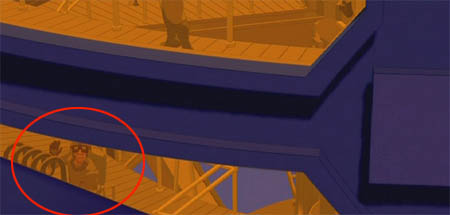 片中當尤里西斯號潛水艇下水之後,有一段很3D的畫面旋轉部分, 在旋轉加速的時候,仔細看的話,會發現潛水艇內有個傢伙正在和攝影機招手微笑喔!(網友鞋子提供)