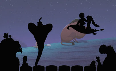 在丁滿離開家鄉之後,沿途經過狒狒拉飛奇所居住的大樹,此時注意夜空,天上的星星排成一個很大的米奇頭喔!