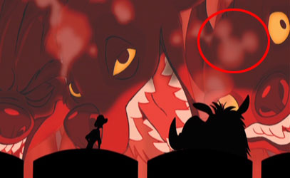 在【獅子王3:Hakuna Matata】當中動畫家放了約20個米奇,而且還在DVD當中安排了尋找隱藏米奇的單元。以下這是在電影剛剛開場的時候,【獅子王】影片被彭彭丁滿按下暫停播放,注意螢幕上有一個米奇頭的煙霧。