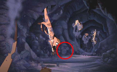 在彭彭丁滿掉落瀑布的這一幕,旁邊的岩石峭壁上有一個米奇頭。