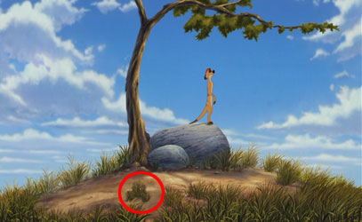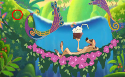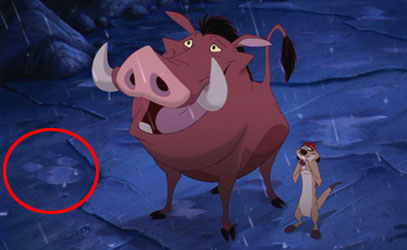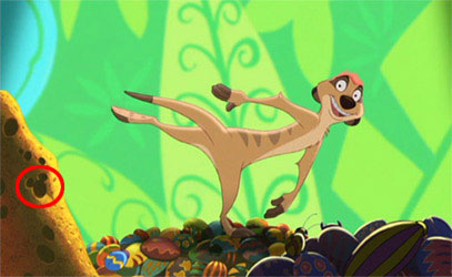 在丁滿與辛巴的蝸牛大戰最後,唯一倖存的蝸牛飛奔逃跑,注意在蝸牛旁邊,有一個米奇頭。