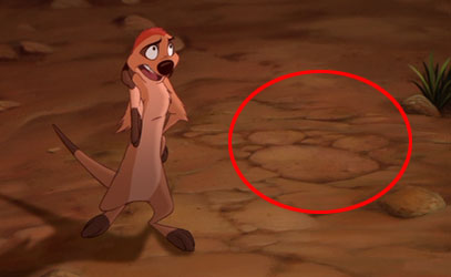 彭彭丁滿救小辛巴的那一場景,地面都被烈日曝曬龜裂,注意地面龜裂的紋路,其中藏著一個米奇頭。
