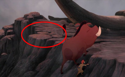 彭彭與丁滿決定幫助辛巴復國,當他們來到已經殘破不堪的榮耀王國,地面間隙的懸崖邊,出現了一個米奇頭。