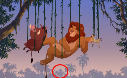 當辛巴、彭彭、丁滿在樹藤上悠閒晃盪,在他們身後遠方背景的樹叢中,藏著一個米奇頭。