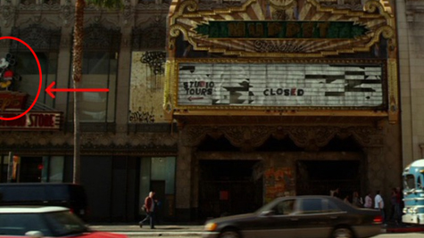 【布偶歷險記】片中的布偶劇院其實迪士尼旗下的是El Capitan Theatre,迪士尼影片常在這裡首映,戲院旁邊的商店招牌造型就是米老鼠,這一幕是布偶劇院翻修前一片荒涼的頹廢景像。 (網友Jenny 提供)