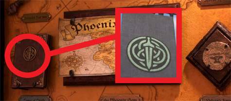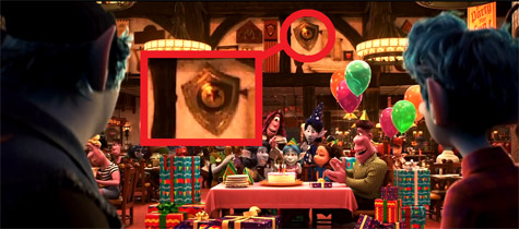 在酒館的牆上,鳳凰寶石地圖左邊的書封面是來自【勇敢傳說】片中部落的標誌。(網友tony stark 提供)