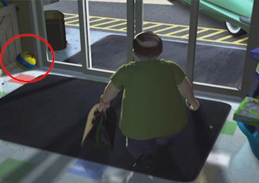當艾爾要離開玩具店的時候,他的左邊地上有一個玩具球,這個球就跟皮克斯短片【頑皮跳跳燈】裡的小檯燈玩的那個球是一樣的。